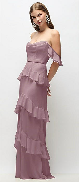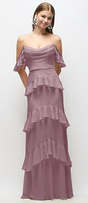 Off-the-Shoulder Cowl Chiffon Tiered Ruffle Maxi Dress with Convertible Ruffle Straps in dusty rose