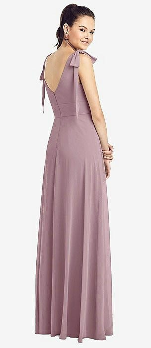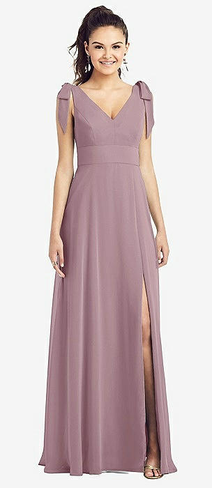 Bow-Shoulder V-Back Chiffon Gown with Front Slit in dusty rose