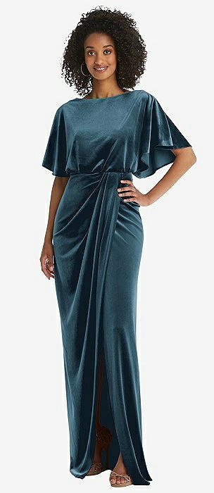 Flutter Sleeve Open-Back Velvet Maxi Dress with Draped Wrap Skirt