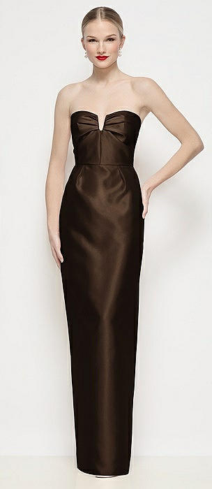 Strapless Pleated Empire Satin Column Maxi Dress in espresso