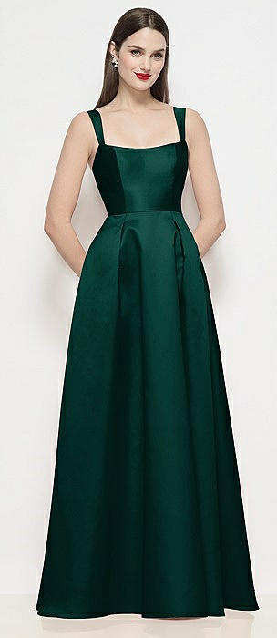 Shaped Strap Basque Neck Satin Maxi Dress with Column Skirt in evergreen