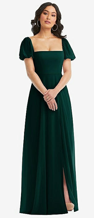 Square-Neck Satin Maxi Dress with Full Skirt in evergreen