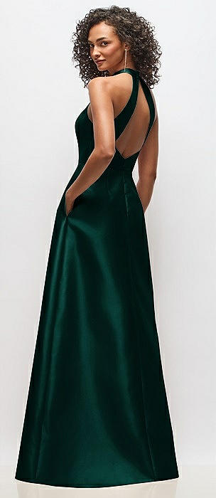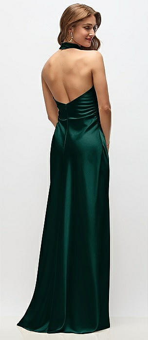 High-Neck Halter Open-Back Satin Trumpet Dress in evergreen