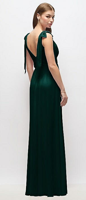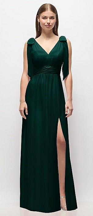 Plunge Neckline Bow Shoulder Empire Waist Chiffon Maxi Dress in evergreen