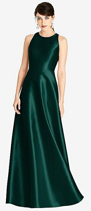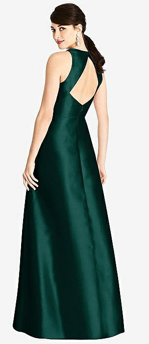 Open Neckline Cutout Satin Twill A-Line Gown with Pockets in evergreen