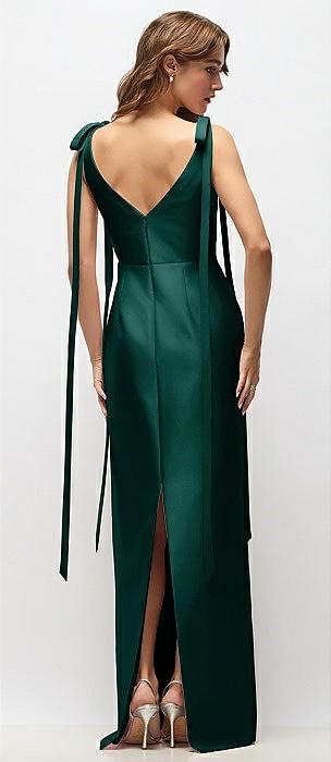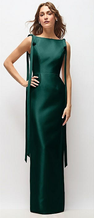 Bateau Neck Satin Column Maxi Dress with Exaggerated Tail Bow Straps in evergreen