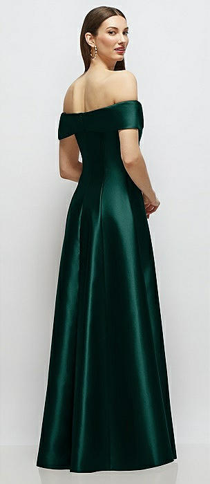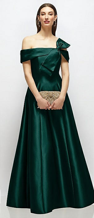 Asymmetrical Bow Off-Shoulder Satin Gown with Ballroom Skirt in evergreen