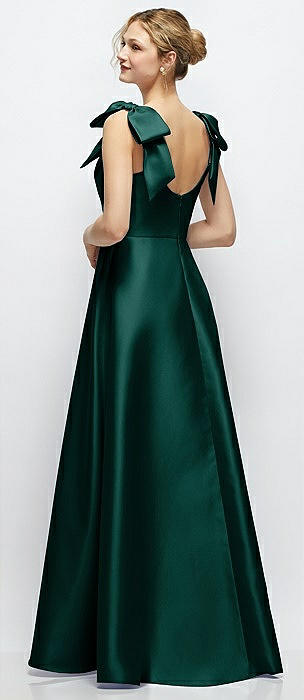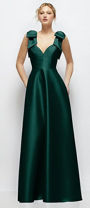 Deep V-Neck Satin Ball Gown with Shoulder Bows in evergreen