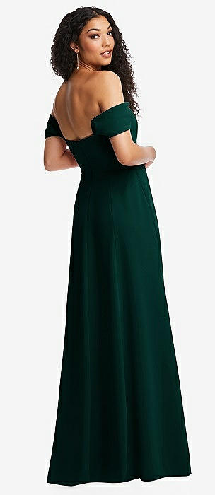 Bow-Shoulder V-Back Chiffon Gown with Front Slit in evergreen