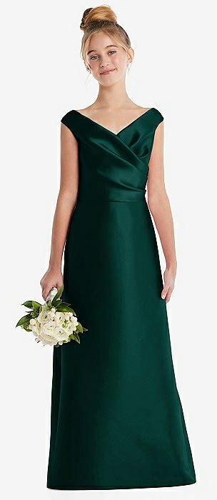 Off-the-Shoulder Draped Wrap Satin Junior Bridesmaid Dress in evergreen
