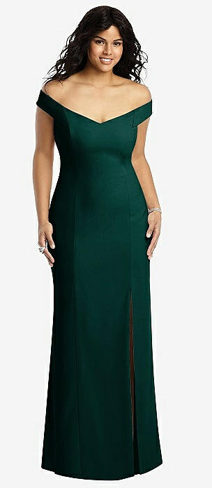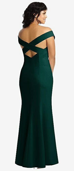 Off-the-Shoulder Criss Cross Back Trumpet Gown in evergreen