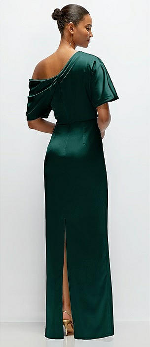 Asymmetrical Off-the-Shoulder Pleated Satin Maxi Dress in evergreen