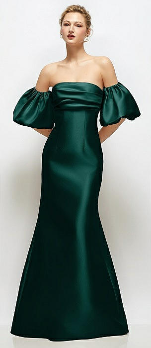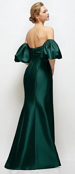 Off-the-Shoulder Puff Sleeve Satin Maxi Dress with Flared Skirt in evergreen