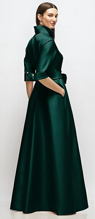 3/4 Sleeve Satin Shirt Dress Gown with Sash and Jeweled Buttons in evergreen