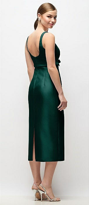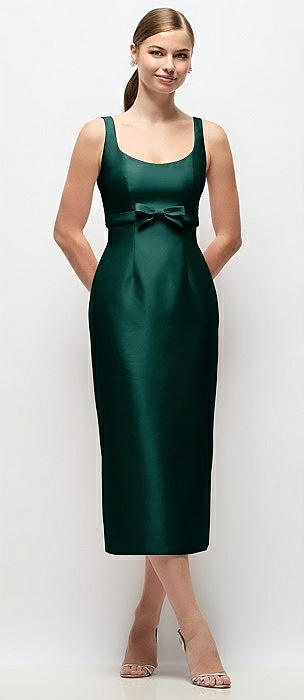 Scoop Neck Satin Column Midi Dress with Bow at Empire Waist in evergreen