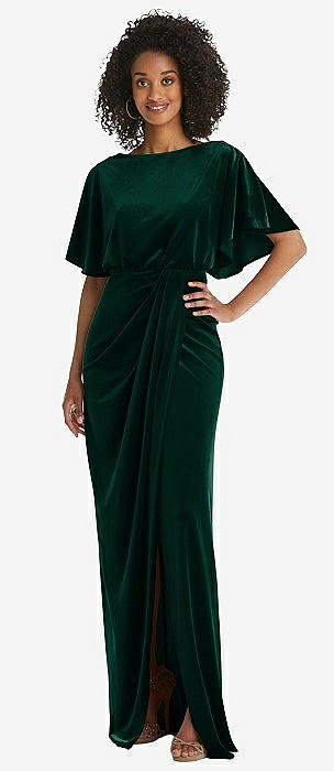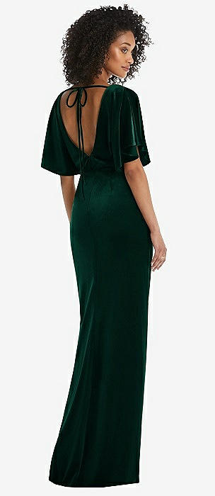 Flutter Sleeve Open-Back Velvet Maxi Dress with Draped Wrap Skirt