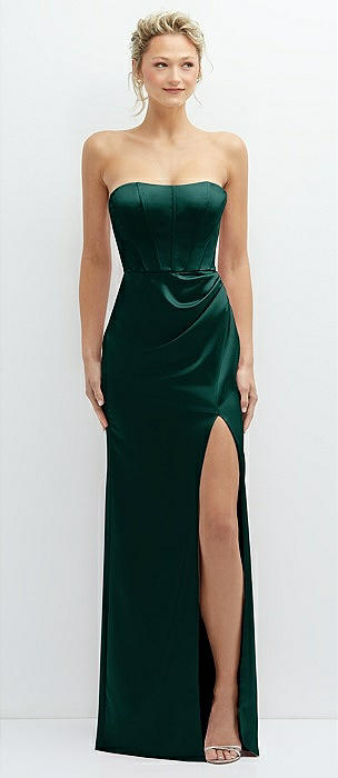 Strapless Topstitched Corset Satin Maxi Dress with Draped Column Skirt in evergreen