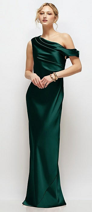 One-Shoulder Draped Bodice Stretch Satin Column Maxi Dress in evergreen