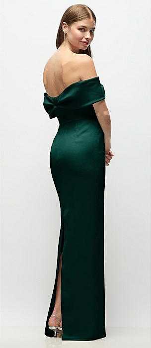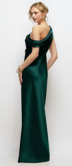 Asymmetrical Off-the-Shoulder Pleated Satin Maxi Dress in evergreen