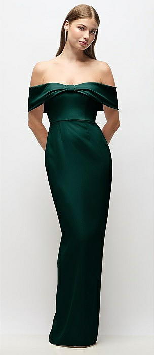Off-the-Shoulder Crepe Column Maxi Dress with Bow-Pinch Detail in evergreen
