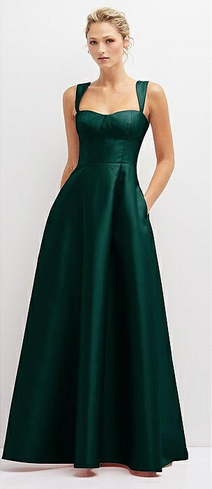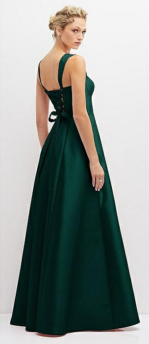 Lace-Up Back Bustier Satin Dress with Full Skirt and Pockets in evergreen