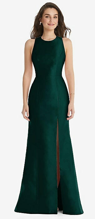 Jewel Neck Bowed Open-Back Trumpet Dress with Front Slit in evergreen