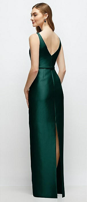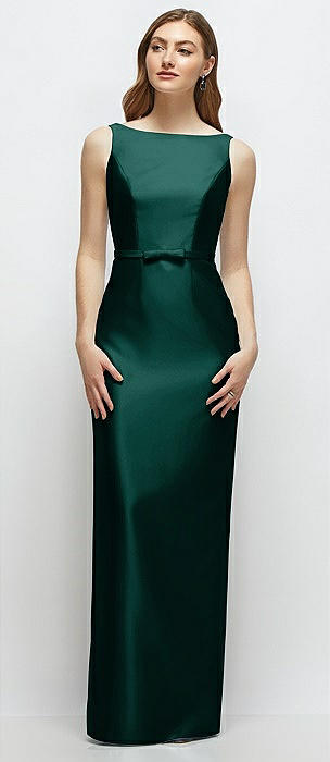Bateau Neck Satin Column Dress with Bow-Trimmed Skinny Belt in evergreen