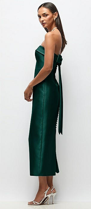 Strapless Cuff Satin Midi Dress with Column Skirt & Back Bow in evergreen