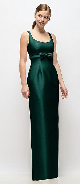 Scoop Neck Satin Column Maxi Dress with Bow at Empire Waist in evergreen
