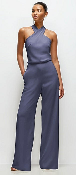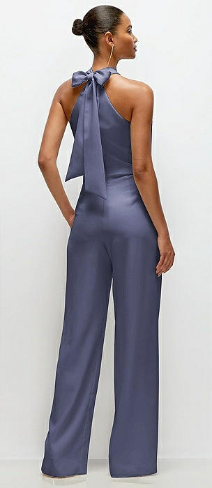 Pleated Halter Blouson Crepe Wedding Jumpsuit with Self-Tie Bow Back in french blue