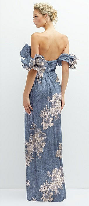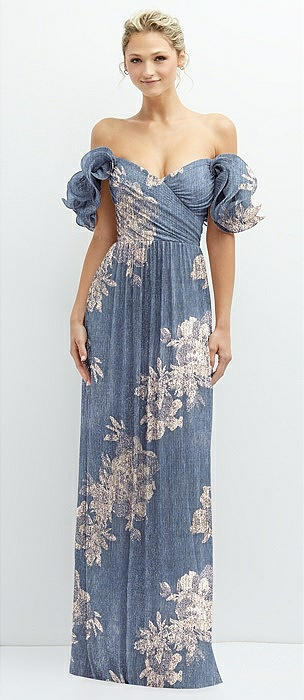 Dramatic Ruffle Edge Convertible Strap Metallic Pleated Maxi Dress with Floral Gold Foil Print