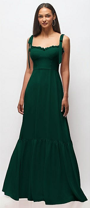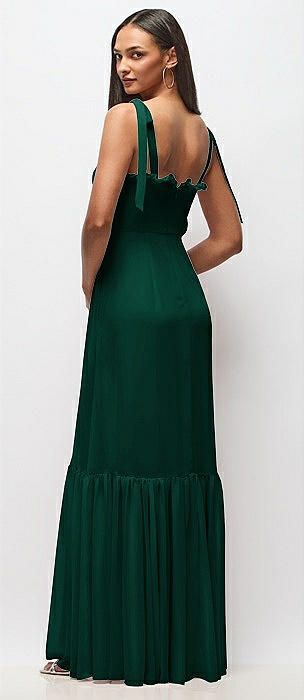 Tie-Shoulder Bustier Bodice Ruffle-Hem Maxi Dress in hunter green
