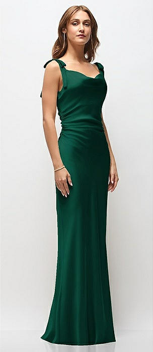 Soft Cowl Neck Ruched Side Satin Bias Maxi Dress with Shoulder Bows in hunter green