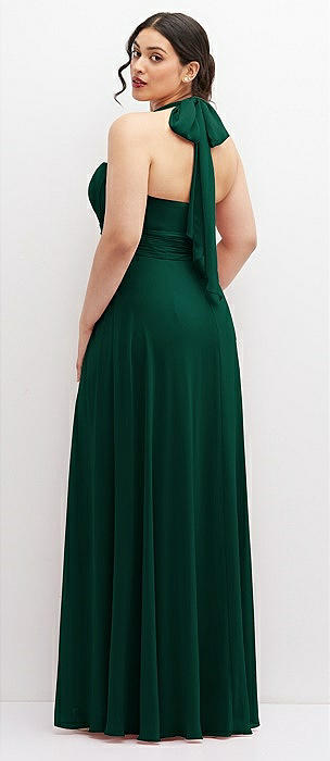 Shirred Skirt Jewel Neck Halter Dress with Front Slit in hunter green