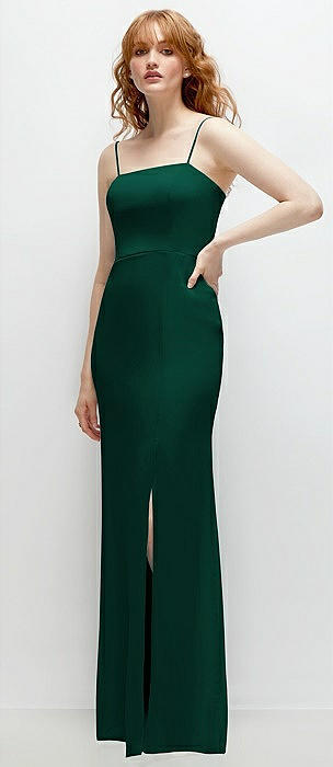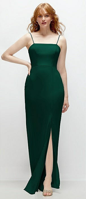 Spaghetti Strap Draped Skirt Gown with Front Slit in hunter green