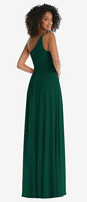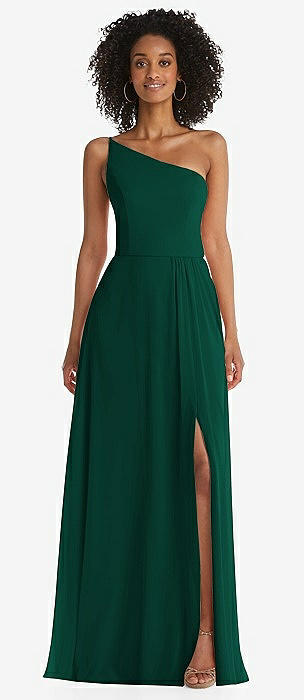 One-Shoulder Chiffon Maxi Dress with Shirred Front Slit in hunter green