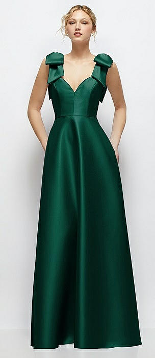 Deep V-Neck Satin Ball Gown with Shoulder Bows in hunter green