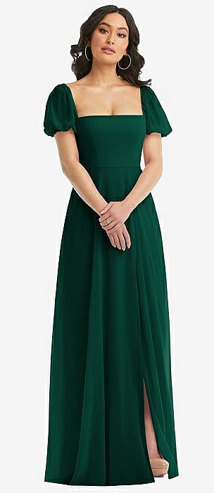 Puff Sleeve Chiffon Maxi Dress with Front Slit in hunter green