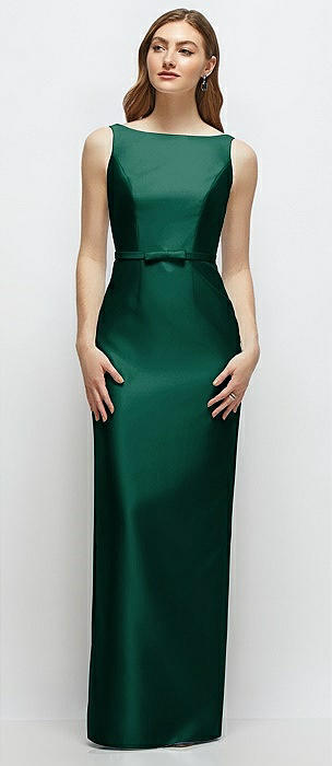Bateau Neck Satin Column Dress with Bow-Trimmed Skinny Belt in hunter green