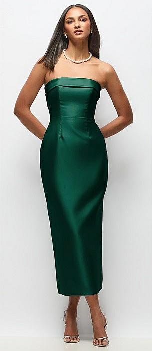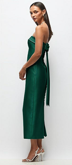 Strapless Cuff Satin Midi Dress with Column Skirt & Back Bow in hunter green