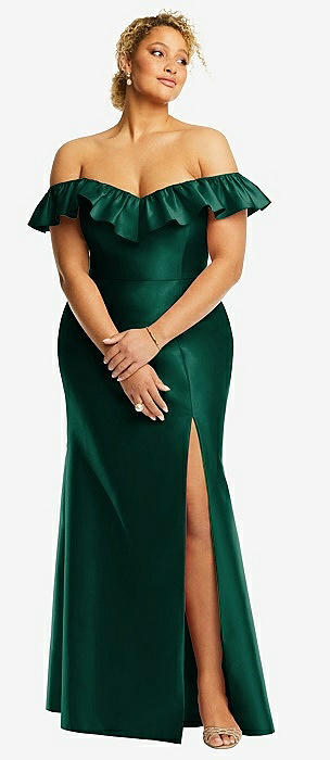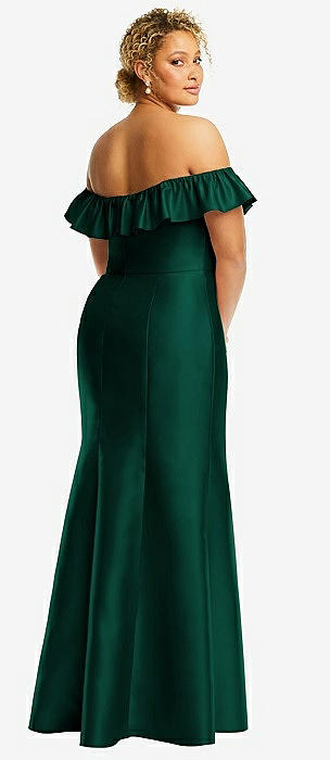 Off-the-Shoulder Ruffle Neck Satin Trumpet Gown in hunter green
