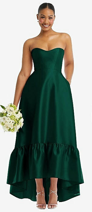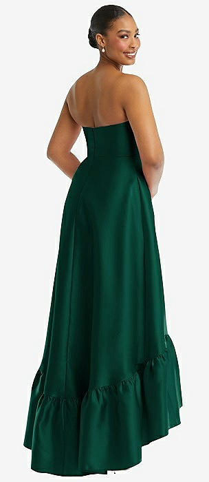 Strapless Deep Ruffle Hem Satin High Low Dress with Pockets in hunter green