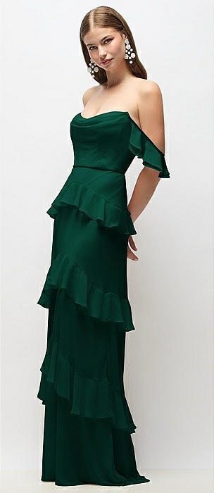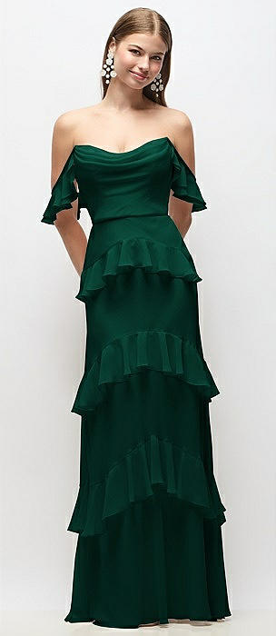 Off-the-Shoulder Cowl Chiffon Tiered Ruffle Maxi Dress with Convertible Ruffle Straps in hunter green