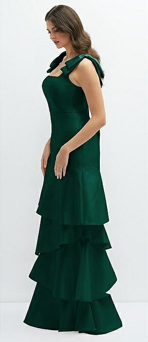 Bow-Shoulder Satin Maxi Dress with Asymmetrical Tiered Skirt in hunter green