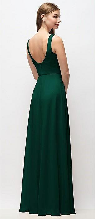 Bow-Shoulder V-Back Chiffon Gown with Front Slit in hunter green