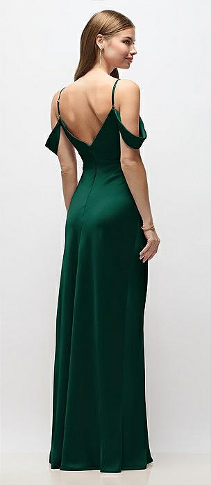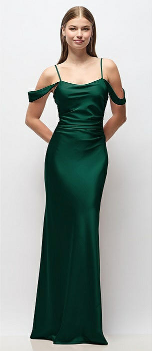 Off-the-Shoulder Swag Ruched Side Satin Bias Maxi Dress with Adjustable Spaghetti Straps in hunter green