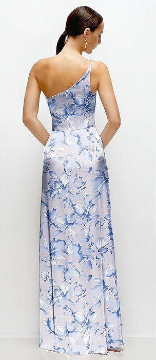 Floral Pleated One-Shoulder Satin Maxi Dress with A-Line Skirt in magnolia sky