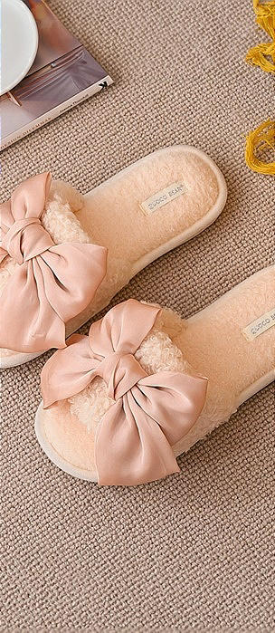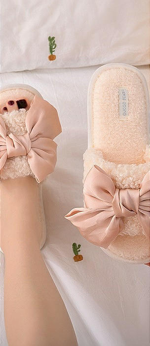 Open-Toe Fluffy Slippers with Silky Knot-Bow for Bridesmaids in blush