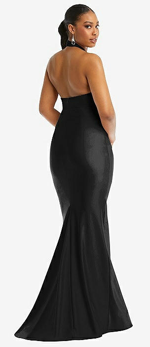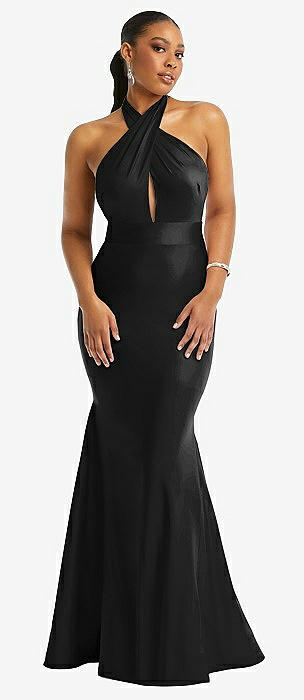 Criss Cross Halter Open-Back Stretch Satin Mermaid Dress in black