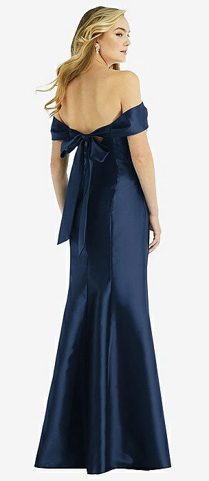 Off-the-Shoulder Bow-Back Satin Trumpet Gown in midnight navy